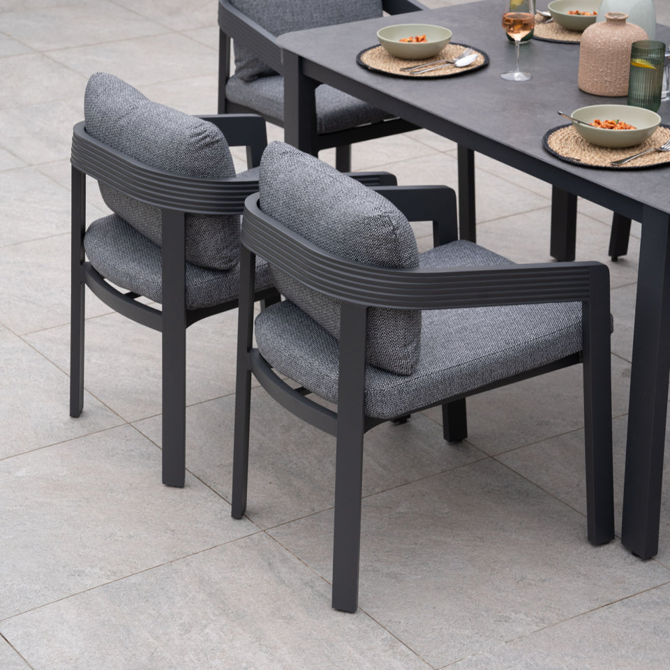 Dine in style with the Ridge View 6 seater high dining set with rectangular table - Ash Grey. For those who prefer an elevated dining experience, our high dining tables come with raised dining chairs and a taller table, adding an extra dimension of comfort and style to your outdoor space.The Ridge View collection boasts a modern and sophisticated look, with the framework of the table and chairs crafted from powder-coated graphite grey aluminium. This durable material ensures longevity and resistance to the elements, making it a perfect addition to any garden. Complementing this sturdy frame...