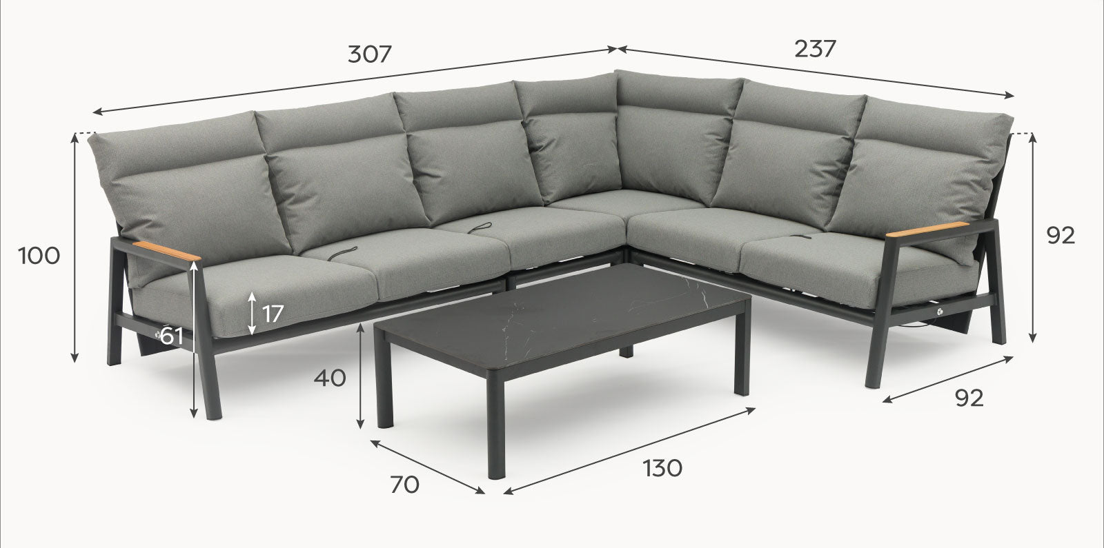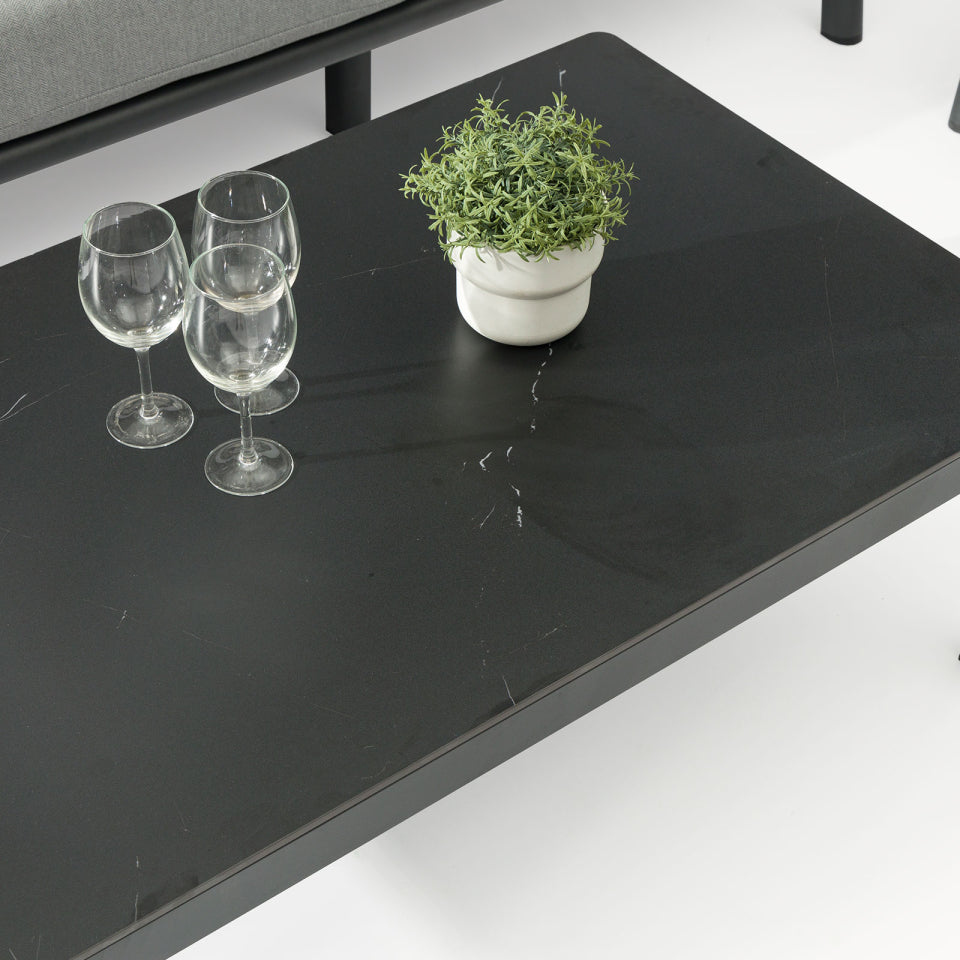 The North Crest corner sofa lounging set with square coffee table - Charcoal grey is your go-to lounging sofa to get you spending more time outside season after season.Constructed with powder-coated aluminium, our North Crest collection offers you peace of mind knowing your set wont rust. The graphite grey frame not only adds a modern touch but also seamlessly complements our range of grey aluminium garden accessories.Sink into comfort with cushions upholstered in high-performance fabric cushions, stopping rain water in its tracks. The water will bead on top and simply roll off. Leave the N...